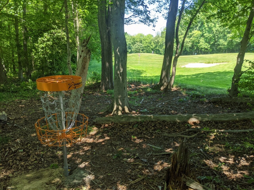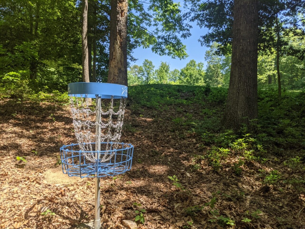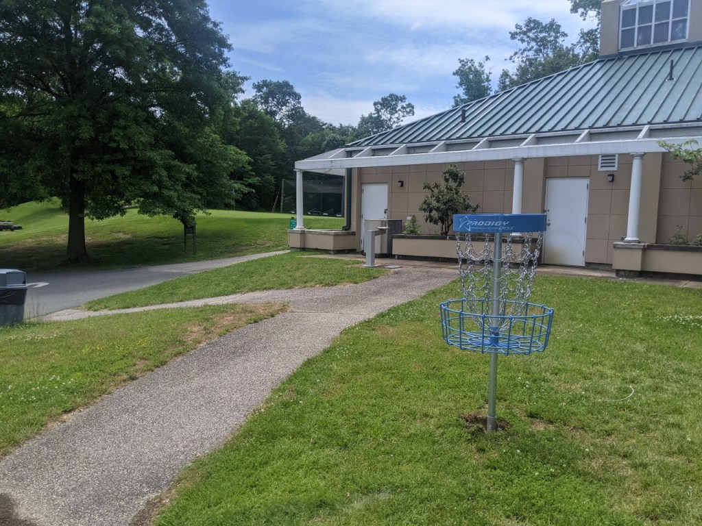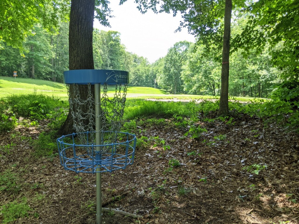 18 baskets are scattered around the edges and within the trees of the walking only 9 hole golf course with long and short disc golf loops providing a unique challenge among the DC metro disc golf courses.