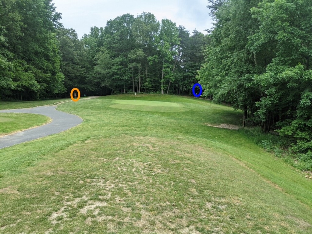 To make the par 58 score on the first disc golf course in Prince William County, players must have thoughtful disc selection and precise shot execution. Several of the greens feature obstacles and others have significant roll away potential for missed putts. The short loop of yellow baskets measures just under 6,000 feet and the longer loop adds the challenge of over 7,800 feet. The only out of bounds areas are the golf greens and over any of the fences that border the property.